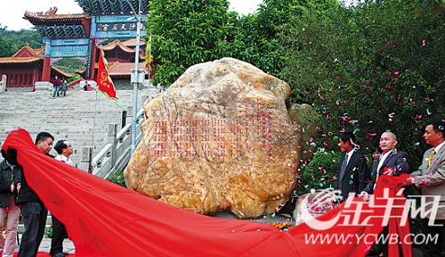 11月14日上午,廣州南沙天后文化學(xué)會(huì)第一屆理事會(huì)暨會(huì)員大會(huì)在南沙區(qū)召開。會(huì)后舉行了奇石安放儀式,一塊重達(dá)40多噸,專門從福建媽祖故里——莆田地區(qū)運(yùn)來的奇石正式安放在天后宮廣場。據(jù)介紹,這塊黃臘石高3.5米,寬4.6米,厚2.2米,如此巨大的一塊天然黃臘石,極為罕見。