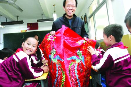 看著穿著統(tǒng)一校服的同學(xué)們,福州刺繡傳人張三忠說(shuō):“如果是在過(guò)去,七八歲孩子的衣服上會(huì)有好多花樣,花紋圖案都是繡上去的!闭f(shuō)著,他拿出一幅繡品,一件繡著金線鳳凰的紅色綢緞,同學(xué)們都說(shuō)太好看了,都想用小手摸一摸,張先生爽快地答應(yīng)了。孩子們一個(gè)個(gè)走過(guò)去,用手觸摸有上千年歷史的福州刺繡。張先生說(shuō),此時(shí)他想到,“未來(lái)”正在感知“歷史”。