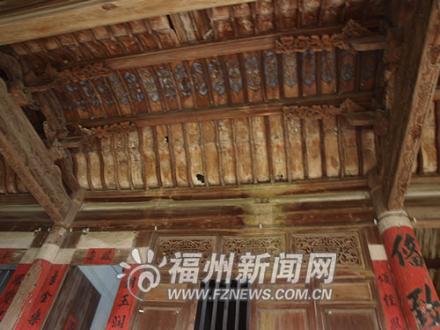 戴祥滋故居為四合院式民居,建于民國初期,系穿斗式木構(gòu)架,面闊五間,大門前有大埕,正座建有前軒廊,后院有天井和單坡頂?shù)幕乩龋扔覀?cè)有附厝,左側(cè)50米處設(shè)有門樓和石構(gòu)三層碉樓各一座。記者發(fā)現(xiàn),該宅規(guī)模較大,建造裝修十分講究,屏門上方及軒廊、梁架等處均雕刻有精美的圖案,色彩明麗。