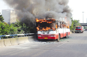 早8點(diǎn)35分,北京市東南三環(huán)華威橋南側(cè)一輛638路公交車(chē)發(fā)生自燃,司機(jī)在發(fā)現(xiàn)危險(xiǎn)情況后立即將公交車(chē)?枯o路安全地帶,疏散車(chē)內(nèi)乘客,并報(bào)警,8時(shí)50分,公交車(chē)大火被消防員迅速撲滅。