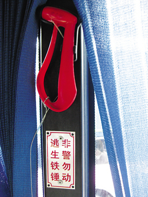 昨天,記者在100路、33路等公交車(chē)上看到,每把逃生錘和它的底座之間,都有一條結(jié)實(shí)的麻繩相連!叭绻覀儾唤o逃生錘的末尾裝上小繩子,將它綁在架子上的話,車(chē)子出去跑一個(gè)來(lái)回,五把錘子就得丟四把。”司機(jī)說(shuō)。