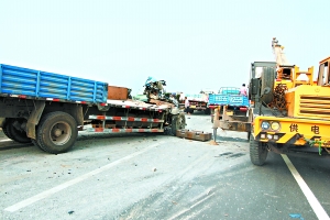 上午8時,記者趕到現(xiàn)場時,飲鹿池橋雙向仍有些擁堵。貨車事故發(fā)生在東向西最內側車道上,一輛吊車正在把從事故車上分離出來的零件吊到其他貨車上運走,外側只有一條車道可供通行。而西向東的撞人現(xiàn)場已基本清理完畢,交通逐漸恢復。
