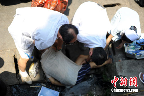 中新網(wǎng)重慶7月30日電(連肖 劉函冉)30日下午14時(shí)許,記者路過(guò)重慶陳家坪汽車(chē)站時(shí)看到,一六旬老人倒在車(chē)站出站口外的排水溝里!120”急救人員稱(chēng),該老人極有可能是因下空調(diào)車(chē)后,無(wú)法適應(yīng)室外40多度的高溫,突發(fā)心腦血管疾病猝死。