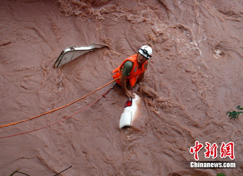 事故現(xiàn)場,墜河的汽車是一輛金杯面包車,車體已經(jīng)完全掉入周公河中,由于連日暴雨,周公河河水暴漲,水流湍急,墜河車體只露出車尾的一小部分。汽車在洪水的沖刷下還在不斷晃動,隨時有被洪水沖走的可能。