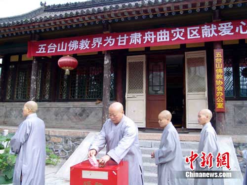 當(dāng)甘肅舟曲泥石流災(zāi)害的消息傳到五臺山時(shí),再次揪疼了五臺山僧眾的心。為幫助受災(zāi)群眾順利重建家園,身在佛門心系天下蒼生的他們,不論是黃廟的,還是青廟的,不論貧富,不分遠(yuǎn)近的大大小小的40多處寺廟和近千個(gè)四眾弟子,以同樣真切和濟(jì)世之情,共同援手,在不到一個(gè)小時(shí)的時(shí)間里,捐款數(shù)達(dá)到了53.6380萬元人民幣,其中普壽寺捐款10萬元,萬佛閣6萬元,塔院寺5.5萬元、普化寺5萬元,其它寺院均盡自己的力量出資捐助。目前,善款已轉(zhuǎn)交有關(guān)部門,但捐款活動(dòng)仍在繼續(xù)進(jìn)行。