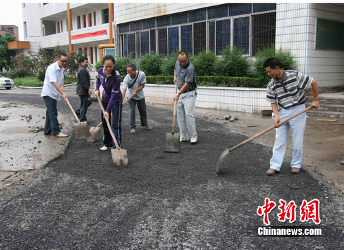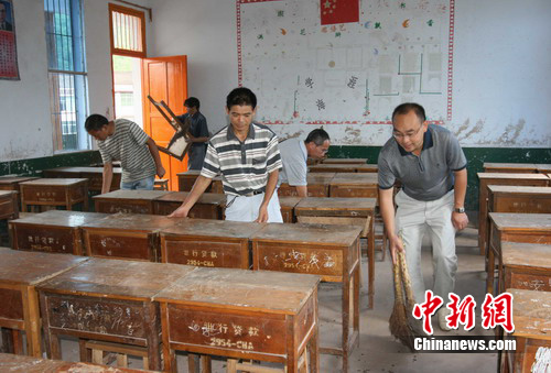 在工地上,記者見到了正在監(jiān)督工程質(zhì)量的官盛鎮(zhèn)小學(xué)校長袁道川,過于疲倦的雙眼深陷,但仍顯得精悍而干練!皬7月18日起,我們的教職員工和班子成員都在堅守崗位,由于今年的水位高、淤泥多,校園恢復(fù)重建難度相當(dāng)大。為了對全鄉(xiāng)的中小學(xué)生負(fù)責(zé),必須加班加點地重建。300套學(xué)生桌凳全部到位,8月30日,學(xué)生順利入學(xué)沒有問題!