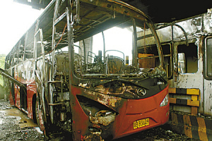 交警和消防人員接警后趕到現(xiàn)場,此前收費(fèi)站工作人員已積極投入到滅火搶險中,乘客在司機(jī)的指引下均已從大巴砸碎的玻璃窗中順利逃出,在安全地方等待,無人員傷亡。在消防人員用高壓水龍頭噴射半小時后,大火才被撲滅了。