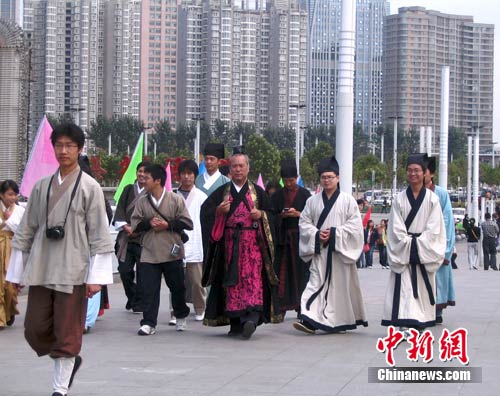 白楊是這群人里為數(shù)不多的女性。她告訴記者,自己一直就很迷戀中國(guó)古代的服飾,這次穿的衣服是在網(wǎng)上訂做的,總共花費(fèi)不足二百元,現(xiàn)在能有機(jī)會(huì)穿出來,真的很高興。今天在路上,還有人問白楊是不是韓國(guó)人,“呵呵,以后每逢傳統(tǒng)節(jié)日都會(huì)這樣穿著,我要讓大家知道這叫漢服!”