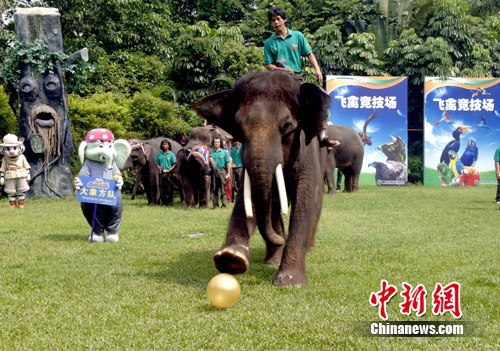 陣容最強大的壓軸方隊是10只大象,它們參加了運動會的球類項目,比賽現(xiàn)場擺了4個大氣球,大象向著觀眾席大腳一踢,觀眾都不自覺地當起守門員,穩(wěn)穩(wěn)地把球接住。