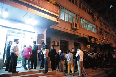 昨天凌晨5點(diǎn)多,海淀區(qū)婚登處門外已經(jīng)排起了近100米的長隊(duì)。排隊(duì)的人幾乎都是一對對,但排在第一位的卻只有一個人,是一名姓胡的中年男子。
