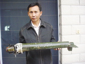 昨天一大早,記者來(lái)到朱賢文家,那是一幢很漂亮氣派的別墅式的小三樓建筑,樓下還開(kāi)有一家小店。小朱正在院子里盤弄著一個(gè)類似火箭彈一樣的綠色物體,在他腳下的一只破臉盆里,凌亂的放著些黑色部件。小朱說(shuō),這些零部件都是彈體上掉下來(lái)的,他也不知道是些什么玩意。附近多名村民也圍聚在小朱家中,一邊看稀奇一邊熱議這到底是個(gè)什么東西,同時(shí)探討小朱該到何處去尋求賠償。