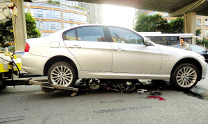 據(jù)目擊者介紹,事發(fā)時,這輛牌號為滬H的銀灰色寶馬轎車沿曲陽路由北向南行駛,至東體育會路附近時與一輛電瓶車發(fā)生碰撞。電瓶車被撞倒,騎車的中年男子當場倒地。30多歲的女司機在慌亂中或許錯將油門當成了剎車,轎車猛沖向前,將電瓶車一路往前推行數(shù)米遠。最終,男子連人帶車被卷入轎車底盤,轎車則卡在電瓶車上,后輪騰空,車身動彈不得。