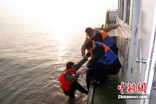 3名船員被接到海巡艇上,海事人員開(kāi)啟了空調(diào),并給船員送上衣服和開(kāi)水。目前,九江海事局正在組織沉船打撈工作。