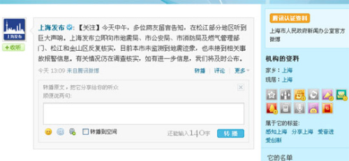 記者從上海市政府新聞辦公室官方微博“上海發(fā)布”獲悉,今天中午,有網(wǎng)友留言告知,在松江部分地區(qū)聽到巨大聲響。上海發(fā)布立即向市地震局、市公安局、市消防局及燃氣管理部門、松江和金山區(qū)反復核實,目前本市未監(jiān)測到地震跡象,也未接到相關(guān)事故報警信息。有關(guān)情況仍在調(diào)查核實,如有進一步信息,將及時公布。(記者 劉軍濤)