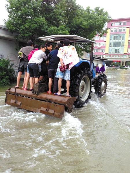 臺風“菲特”帶來的強降雨致使道路成了洼地,過路成了“過河”,給人們出行帶來極大的不便。昨天,鄞州橫溪鎮(zhèn)的小伙子張超,特地開著自家耕田用的拖拉機,來回載著村民們進出村里。