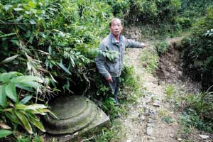 “竹子一砍掉后,一個(gè)巨大的房柱石地盤(pán)就露了出來(lái),顏色有些發(fā)青。坍塌的坑里有很多青瓦。”