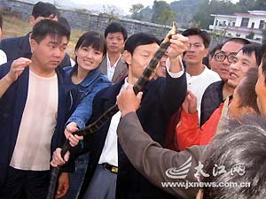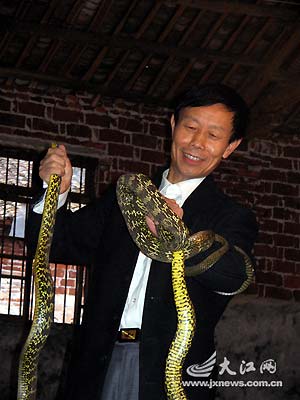 10月16日,本報(注:江南都市報)記者赴宜春向蛇王老黃拜師學(xué)藝,既感受了隨蛇王體驗抓毒蛇時的心驚膽戰(zhàn),也聽到了蛇王驚心動魄的歷險故事。