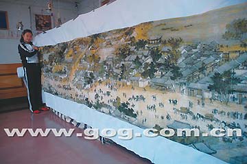 昨日,貴陽市半邊街的龍順珍女士向記者展示了她和10余人,歷時一年半之久,一針一線繡成的30米長十字繡《清明上河圖》。