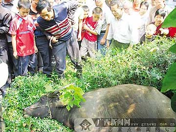 10月21日,一頭水牛被牽進南寧市明秀西路細新巷時,受驚奔走,接連撞倒1男3女后,竄進了南寧市第八人民醫(yī)院內(nèi)一片樹林里。上午10時47分,一聲槍響,水牛被民警擊斃。
