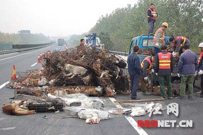 23日凌晨5時許,一臺中型貨車在京珠高速公路湖南段78公里側(cè)翻,貨車上運載的兔子和狗在高速公路上到處亂竄,許多司機為避讓干脆將車停在超車道上。為保障交通安全,交警和施救人員只得在高速公路上四處抓捕、圈圍這些狗和兔子。