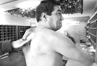同事小童告訴記者,一次,郵政局運羊毛,20公斤的大袋子要抬到約1.3米高的車廂上,其他人都是兩人抬一袋,可阿里甫一人提兩袋,只見他一手抓一袋,很輕松就把一袋羊毛扔到車上!拔覀儽緛砭团宸牧,現(xiàn)在他能用肩胛骨夾斷光碟,我們更佩服他了。”小童說。