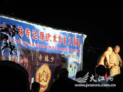 25日19時(shí)左右,從南昌西外環(huán)高速公路灣里路口來了兩輛掛有河南牌照的車,一輛是臥鋪大客車,一輛是面包車。車子開到灣里區(qū)翠園停下后,下來數(shù)十名穿著僧衣剃著光頭的和尚。他們自稱是河南“嵩山少林寺達(dá)摩武術(shù)學(xué)校義演隊(duì)”,在全國(guó)巡回義演和氣功治病,為少林寺募捐。