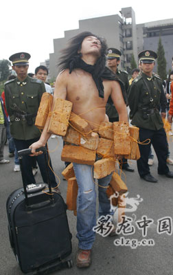 又是他!繼今年5月1日在南屏步行街以全身貼滿人民幣的形式進(jìn)行了一場名為“金錢加權(quán)力等于一切嗎”的行為藝術(shù)后,云南藝術(shù)學(xué)院03級油畫班畢業(yè)生王軍昨天背負(fù)磚頭行走兩個多小時,用他覺得最棒的方式說一聲:“昆明,我走了!