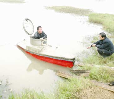 昨日下午3時許,記者來到武昌黃家湖武漢科技大學校門外的一處池塘邊,潛艇下水的前期準備已經(jīng)就緒。刷了一層薄漆的“霞光五號”被2名工作人員用繩子固定在岸邊,另一根20多米長的鋼絲繩將潛艇和岸上的一輛卡車連在一起。李玉明解釋,沒有裝動力系統(tǒng),潛艇還需要卡車的牽引。
