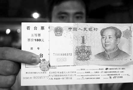 昨日,一讀者向本報(注:東南快報)曝料稱,“張學友廈門演唱會”的門票,用面值1元的人民幣做防偽標簽,該讀者疑惑些舉是否對人民幣的不尊重。