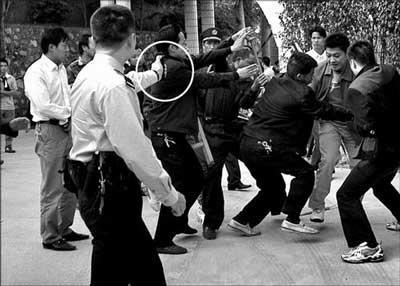 5分鐘后,校方員工再次出動(dòng),有的人手上還拿著兩根一米長(zhǎng)的鐵棍,而工人們順勢(shì)從門口的竹籬笆處拔下七八根碗口粗的毛竹對(duì)鐵棍,雙方開始一場(chǎng)混戰(zhàn),“啪、啪”聲不絕于耳。兩三分鐘后,毛竹被打爛,就在工人高喊著找磚頭時(shí),警方趕到。一名警察一邊高喊“不許打架”,一邊拿著手中的辣椒噴霧器對(duì)著打斗雙方噴射……