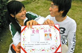 小郭首先在學校里推出了“愛情證書”,受到同學們的青睞,然后他又接著在校園網(wǎng)“貼吧”推廣。目前已有不少大學生情侶訂購。