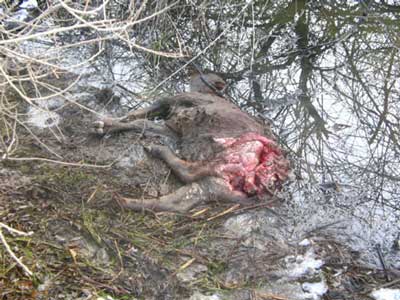 就在這時(shí),動(dòng)保處的同志接到電話:板石鎮(zhèn)孟嶺村五隊(duì)村民趙智國(guó)家的牛被咬死。經(jīng)查,11月9日,趙智國(guó)家一頭3個(gè)月的公牛失蹤,經(jīng)查找在距村屯2公里處的盤(pán)嶺溝發(fā)現(xiàn)牛已被咬死,牛的臀部已被吃掉。11月12日,管理局野生資源保護(hù)處工作人員認(rèn)定該牛確被野生東北虎咬死。