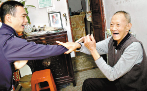 可能是被記者的誠(chéng)意打動(dòng),郭老終于同意接受采訪。郭老雙眼炯炯有神,講話時(shí)總是面帶微笑,沒(méi)有一點(diǎn)武學(xué)大師架子。為了證明自己的寶刀未老,郭富握拳垂直“突擊”面前的木桌,只見(jiàn)桌子迅速反彈后躍起地面足足一寸之高。