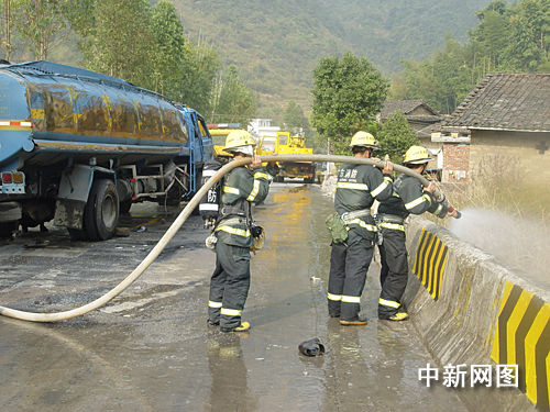 新豐縣公安局副局長(zhǎng)陳如鋒組織交警很快封鎖了現(xiàn)場(chǎng),實(shí)施交通管制。消防官兵穿上防化服,用兩臺(tái)消防車(chē)從河里抽水,用射水槍噴射側(cè)翻的槽罐車(chē),迅速稀釋從車(chē)上流出的液體甲醛。吊車(chē)隨后趕到,工作人員帶上口照,冒著生命危險(xiǎn),靠近槽罐車(chē),將側(cè)翻的槽罐車(chē)吊起,消防官兵繼續(xù)用射水槍向槽罐車(chē)猛烈射水。
