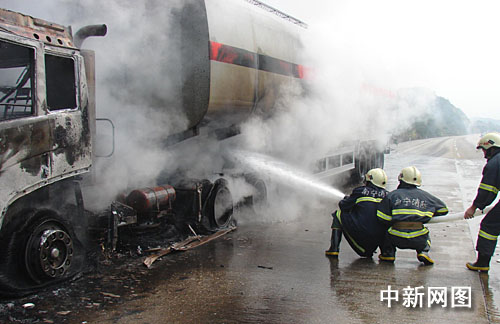 中新網(wǎng)南寧11月19日電(胡明軍)11月18日中午,一輛行駛在廣西南(寧)北(海)高速公路上的油罐車突然燃起大火,車上裝載原油40噸。南寧市消防官兵迅速趕往現(xiàn)場,奮戰(zhàn)30分鐘撲滅油罐車大火,避免了油車爆炸。