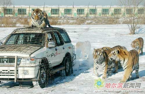 這時,馴養(yǎng)員的投食車駛入園內,老虎知道要開飯了,迅速圍攏過來。隨著一次次撲躍,一只只活雞被老虎叼到嘴里,一只心急的老虎縱身跳到車上,隔著鐵絲網守著投食的天窗不肯離開,直到馴養(yǎng)員伸出木棍驅趕,它才悻悻離去。
