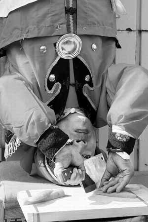 劉永全說(shuō),除了這些,他還能倒立打腰鼓。在助手的幫助下,劉永全左右膝蓋各綁上一個(gè)腰鼓,腰上一左一右系了兩個(gè),然后又在脖子處固定了一個(gè)腰鼓。一切準(zhǔn)備工作做好,劉永全“騰”地一下倒立起來(lái),然后兩手上下翻飛,節(jié)奏感極強(qiáng),鼓聲鏗鏘有力,從旁邊經(jīng)過(guò)的路人也被吸引了過(guò)來(lái)。“樹(shù)活皮,人活臉,出門前一定要化個(gè)妝!眲⒂廊f(shuō)著,拿起放在旁邊的油彩小心地勾勒了起來(lái),一會(huì)兒,勾勒出了一張活靈活現(xiàn)的猴臉。