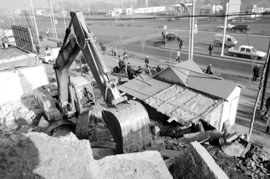 8月14日凌晨3時(shí)45分許,烏市百園路1號(hào)一棟二層樓樓房的錄像廳內(nèi)闖入幾名不明身份的男子。十余把砍刀架在了老板娘劉英軍、老板劉希喬及四名看客的脖子上。6人被捆后又被抬到了自家樓后的一幢在建地下室內(nèi),一個(gè)小時(shí)后,劉家的房子被強(qiáng)行拆除。事發(fā)后,得峰房產(chǎn)公司副總承認(rèn)劉家被拆一事受其指使。至今,劉希喬夫婦還住在他家附近的公廁內(nèi)守著廢墟等待事情的圓滿解決。