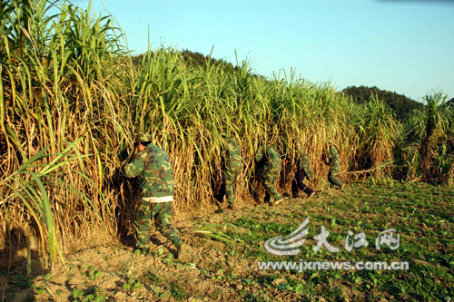 昨日下午3時許,由數(shù)十名德興市武警戰(zhàn)士、上饒市特警、德興公安民警以及民兵等人員組成的搜捕隊再一次來到付家墩,他們對付家墩村村后的百畝甘蔗進(jìn)行了全面搜查。