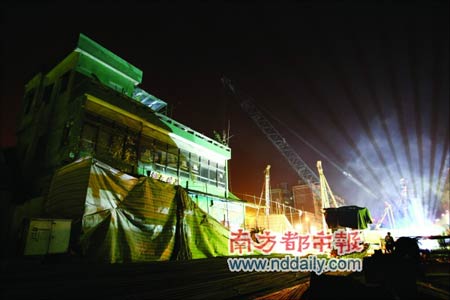 昨日下午6時(shí),位于黃埔區(qū)石化路與大沙地東路口位置的地鐵五號(hào)線工地內(nèi),施工仍然在熱火朝天地進(jìn)行著,打樁機(jī)發(fā)出震耳欲聾的轟鳴、焊接發(fā)出的閃光將周圍照得如同白晝、四處飄散的黃土逼得過路人不得不捂緊口鼻……至少目前來看,地鐵改變施工方式的做法并未改變陸秀華一家的現(xiàn)狀,石化南一街6號(hào),這棟已頗有名氣的綠色小樓,依然身陷地鐵工地的重圍,繼續(xù)其“釘子戶”的生涯。