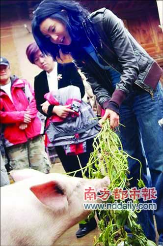 10月11日,張曼玉喂豬。這頭豬后來成了“一代名豬”,但也難逃成為過年豬肉命運。