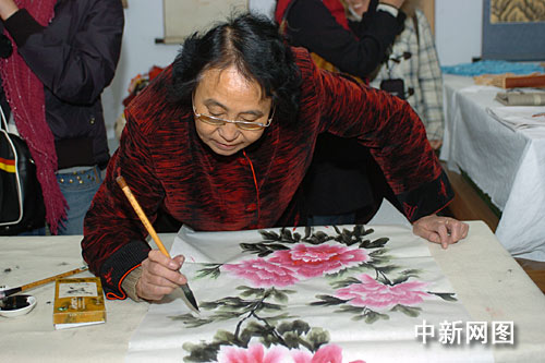 中新網(wǎng)11月28日電 今天下午,“第五屆網(wǎng)上河北行(邯鄲)”網(wǎng)絡(luò)媒體采風(fēng)團來到邯鄲市邯山區(qū)渚河路街農(nóng)林二社區(qū)居民中心參觀。在才藝展示廳內(nèi),展柜上一件件精美小巧的自制手工藝品吸引了眾人的目光,紛紛向制作者請教制作過程。而一幅正在繪畫當(dāng)中的牡丹圖,嬌艷欲滴,記者紛紛拍照留念。