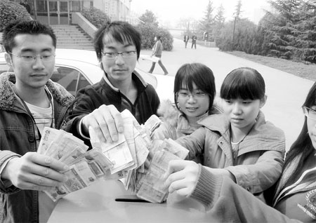 11月30日上午,西北工業(yè)大學(xué)明德學(xué)院的廣播里開始播放《陽光報》和西安騰訊網(wǎng)關(guān)于孔靜救母的報道,去飯?zhí)贸燥埖膶W(xué)生走到募捐處排起長隊捐錢,100元、50元、10元、2元,校友們紛紛將節(jié)省下來的錢投到募捐箱里,。一名大一女生抹著眼淚說:“一個剛畢業(yè)的大學(xué)生,遇到這種事情也太難了,每天少吃一個菜,也要為孔靜姐姐捐些錢!30日下午,馬老師等人帶著全校師生的捐款14183.4元,送到了交大一附院的病房,孔靜不住地擦眼淚。