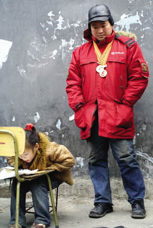 在覃紀(jì)虎的“賣場”,他把榮譽證書及相關(guān)報道的剪報擺了滿地,并打出賣獎?wù)碌恼信,女兒曉艷在一旁靜靜地伏在一把椅子上寫作業(yè)。不時有過往的行人前來觀看,然后為他們捐一點錢。