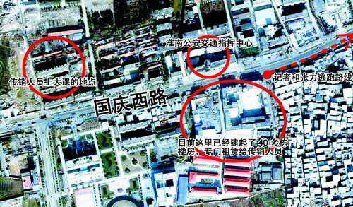 張力簡(jiǎn)單地介紹了情況:一個(gè)龐大的非法傳銷組織,此地大約40棟房屋內(nèi)租住有近5000人,打著“天津天獅生物發(fā)展公司”的旗號(hào),推銷的是一種賺錢的方法,新人入會(huì)交納2800元,采用非法傳銷通用的五級(jí)晉升制度。新人剛來無論干什么都會(huì)有人陪同,寸步不離,包括上廁所和洗澡。