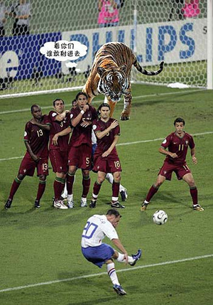 一些網(wǎng)友還為華南虎賦予“靈性”,讓它參與了激烈的足球賽,甚至做起了“門衛(wèi)”。在球賽版的PS照片中,華南虎成為了守門員,正“虎視眈眈”地盯著“對(duì)手”,甚至還威脅“看你們誰(shuí)敢射進(jìn)門”(網(wǎng)友設(shè)計(jì)臺(tái)詞),那場(chǎng)景讓人忍俊不禁。