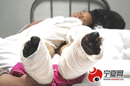 據(jù)楊二喜的姐姐楊銀蓮介紹,她們家住在西吉縣興盈鄉(xiāng)引黃溝村,那里常年干旱,家里的幾畝旱地是連年歉收,加上父親患有眼疾視物不清,母親神智低下,家庭生活非常困難。10年前,楊銀蓮嫁到了離家不遠的一個村子。今年11月24日早晨,她父親急急忙忙到她家尋找母親和弟弟,她才得知母親和弟弟在頭一天就不見了。得到這一消息,鄰居、親戚20多人到處尋找,可是找了兩天都沒有消息。經(jīng)過商議,人們兵分幾路繼續(xù)尋找。11月26日,當(dāng)人們找到離家數(shù)十公里的白城村時,一位老大爺說,11月25日,一個50多歲女人背著一個男孩在他家討過水喝。按照老大爺描述,證實這倆人正是他們苦尋多天的親人。11月27日,被困5晝夜的母親和弟弟終于在附近的一座山上找到了。楊銀蓮回憶說:“當(dāng)時母親和弟弟正坐在一個土坑里,弟弟僅穿著一件薄毛衫,臉凍得發(fā)紫,鞋只剩下一只。弟弟看見我的第一句話便說‘大姐,我快凍死了”,回家后給弟弟換衣服時發(fā)現(xiàn),弟弟的雙腳已凍成了黑色。楊二喜告訴記者:“媽媽背我出來要飯,不知不覺就迷了路,一只鞋也不知道啥時丟了,我的腳在出門的第二天便失去了知覺,這5天中,我們每晚都睡在草堆里,陪伴我的除了媽媽,就是饑渴和寒冷!