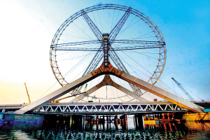“天津之眼”摩天輪2005年開工建設(shè),預(yù)計(jì)明年奧運(yùn)會(huì)前可以開張納客。昨日,在施工現(xiàn)場(chǎng)記者看到,“天津之眼”摩天輪已經(jīng)屹立在永樂橋上,引來許多市民觀看。一位正在釣魚的秦先生說:“趕快拍個(gè)照吧,今后咱們天津的海河又多一個(gè)景點(diǎn)。”