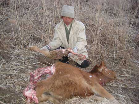 15日早,村民王立舉上山撿柴,發(fā)現(xiàn)了一大一小兩只老虎的蹄印。而一60歲村民說,他兩天前在山里打柴時親眼看到山腳下有一大一小兩只老虎。15日上午9時,祖、樸兩家共4人出去找失蹤的牛。11時許,4人在距寧幾何家死牛處300米的葦塘發(fā)現(xiàn)了祖秉禮家兩天前失蹤的一頭兩歲母牛,后臀已被吃掉了。他們怕老虎就在附近,于是就趕緊各自回家。