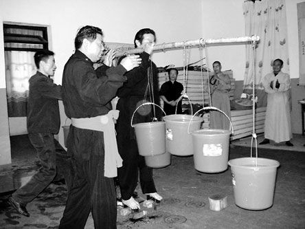 陳師傅說,除了踏刀提水外,他還有金剛腿、金槍刺喉等絕活。“這些功夫源自少林。運功后,身體的肌肉會變硬,可抵擋銳器!彼f,最先練踏刀提水時,是嘗試性地站在刀刃上,當時腳也會被割傷。隨著時間推移,腳皮越練越厚,在刀刃上堅持的時間也越來越長。